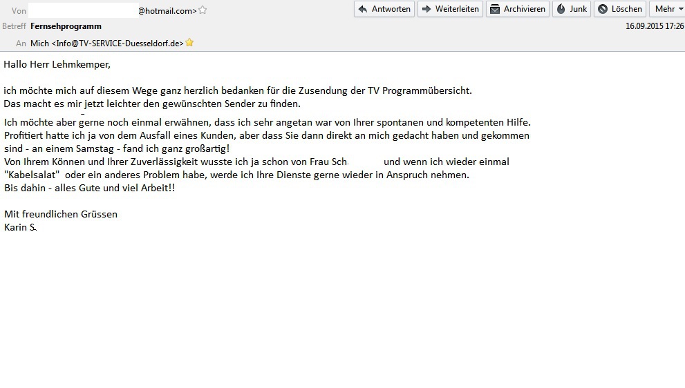 befreien, so dass ich wieder fernsehen kann. TV Service Duesseldorf ist auf jeden Fall empfehlenswert, wenn man Probleme hat. Danke!